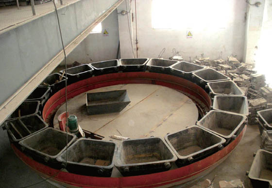 自主開發(fā)產(chǎn)品,由傳動裝置、圓盤、錠模等組成,能將熔煉爐放出的高溫熔融粗鉛澆鑄成約2t/ 塊的鉛錠。