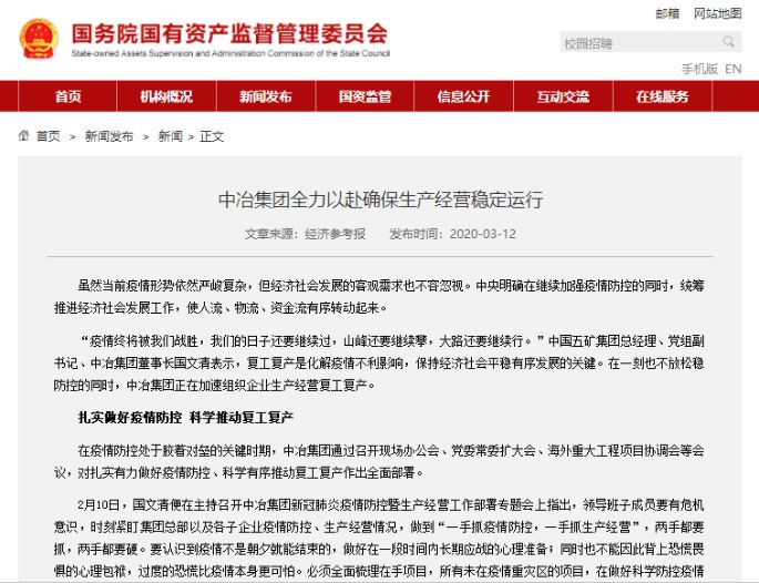 2月10日,國(guó)文清便在主持召開(kāi)中冶集團(tuán)新冠肺炎疫情防控暨生產(chǎn)經(jīng)營(yíng)工作部署專(zhuān)題會(huì)上指出,領(lǐng)導(dǎo)班子成員要有危機(jī)意識(shí),時(shí)刻緊盯集團(tuán)總部以及各子企業(yè)疫情防控、生產(chǎn)經(jīng)營(yíng)情況,做到“一手抓疫情防控,一手抓生產(chǎn)經(jīng)營(yíng)”,兩手都要抓,兩手都要硬。要認(rèn)識(shí)到疫情不是朝夕就能結(jié)束的,做好在一段時(shí)間內(nèi)長(zhǎng)期應(yīng)戰(zhàn)的心理準(zhǔn)備;同時(shí)也不能因此背上恐慌畏懼的心理包袱,過(guò)度的恐慌比疫情本身更可怕。必須全面梳理在手項(xiàng)目,所有未在疫情重災(zāi)區(qū)的項(xiàng)目,在做好科學(xué)防控疫情工作的同時(shí),能復(fù)工的要全面復(fù)工,能開(kāi)足馬力開(kāi)工的要開(kāi)足馬力開(kāi)工,集團(tuán)層面及時(shí)協(xié)調(diào)解決各子企業(yè)項(xiàng)目復(fù)工、開(kāi)工面臨的各項(xiàng)困難和問(wèn)題。